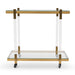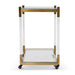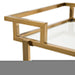 Brushed gold stainless steel frame with acrylic tube Clear glass top & base 2x open shelves Matching caster wheel The product comes as a flat pack and requires 2 person assembly