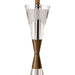 The Spirit Lamp takes a hard angle on the transparency trend in design. The lamp`s body is a geometric masterpiece with sharp angles and multiple facets. It`s clear crystal form is accentuated by the pale brass rod extending all the way from its base to its pinnacle. Topped with an white linen drum shade.