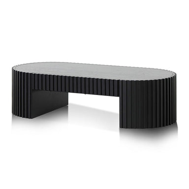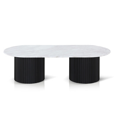 Black engineered wood base with vertical lines Real marble in elliptical tabletop with grey veining Fluted matte black finish 2x spherical black ba...