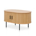 Engineered wood with veneer in natural finish Sturdy black metal legs Lacquered finish Oval top with curved edges Side sliding doors with matte black handle Weight Capacity: 80 kg Product is flat packed and requires two-person assembly