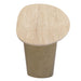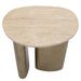 Elevate your interiors with this chic, sculptural side table, available in two complementary sizes that can be paired together or styled individually. Featuring a smooth travertine top and a modern antique brass-finished base, each piece embodies timeless sophistication. Their asymmetrical designs add a contemporary edge, making them perfect accents for any living room, bedroom, or office. Ideal for holding decor or everyday essentials, these versatile tables combine practicality with style, enhancing both modern and classic spaces with their luxurious finish.
