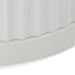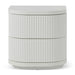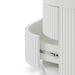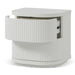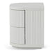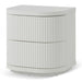 Body is made of engineered wood Finished in matt white paint 2× drawers with slides for pull-opening Drawers and sides designed with vertical grooves Metal base with matt white powder coating Top panel is finished in wood textured veneer Distributed weight capacity of 30kg Product is fully assembled