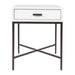 Sleek and refined, the Nessa bedside table is available in a playful myriad of finishes to suit your bedroom or living room. Featuring a lacquered crisp white finish sitting atop a minimalist black powder coated tapered metal frame and coordinating drawer pull adds an element of charm to this petite single drawer bedside table.