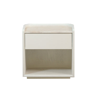 Travertine marble tabletop Engineered wood with ash mountain grain finish Soft ivory oat tone Open shelf storage Smooth-glide drawer Subtle grain d...