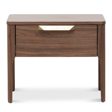 Engineered wood and walnut veneer construction Includes E1 standard panelling Brushed brass geometric handle Leg interior features curved design 1x...