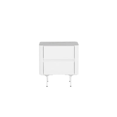 Sintered stone tabletop White engineered wood side and drawer panels White melamine board for other components Y-shaped metal legs with white powde...