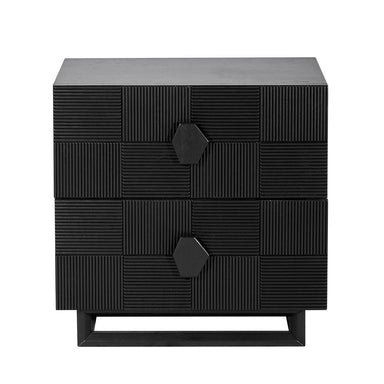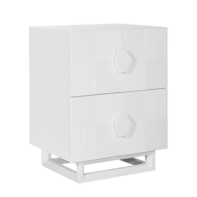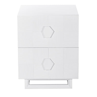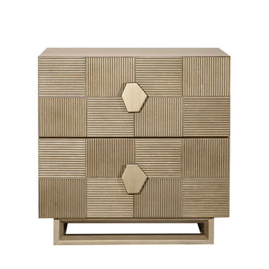 Elevate your bedroom with this stunning two-drawer bedside table, crafted with an elegant brushed gold finish and intricate geometric detailing. It...