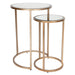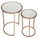 This beautifully adaptable nest of two side table set has been finished with a subtle antique gold finished frame and inlaid antique mirror tabletops. The fantastic nesting ability allows for a practical and versatile living piece.