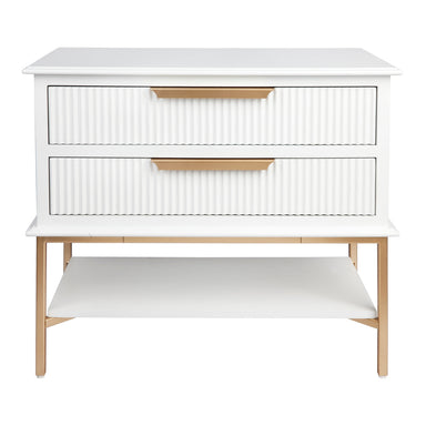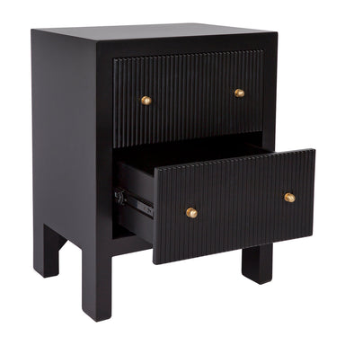 Our Ariana small bedside table makes a big impact with its fluted drawer fronts, brushed gold handles, and rich colour. Its textural finish and sli...