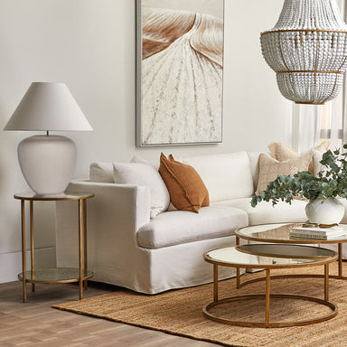 This beautifully adaptable nest of two side table set has been finished with a subtle antique gold finished frame and inlaid antique mirror tableto...