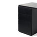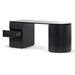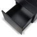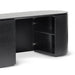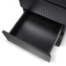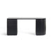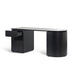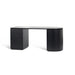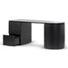 Made of engineered wood with veneer Thick table top with under chamfered edge Right cabinet has 2x shelves & a door with overlay hinges Left side has 3x drawers with soft close runners Grooved slats design Product requires minor assembly