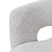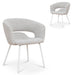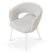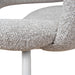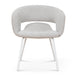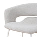 Clay grey polyester upholstery Iron frame and legs Foam filling Soft-medium seat firmness White metal frame complements fabric seat Arched backrest Perfect for small or minimalist spaces Weight Capacity: 150 kg Minor assembly required