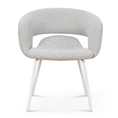 Clay grey polyester upholstery Iron frame and legs Foam filling Soft-medium seat firmness White metal frame complements fabric seat Arched backrest...