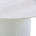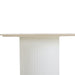Travertine top Engineered wood base Matte white finish Cylindrical base with fluted detailing Sleek, modern, and luxurious design Ideal dining room centerpiece Minor assembly required Note: Please note that our standard warranty does not apply to natural stone products. All travertine products are carefully inspected and securely packaged in a wooden crate, which will require your own tools to open. Travertine is a natural stone, and each piece possesses its own unique imperfections and characteristics. Variations in color, texture, polish, and pattern are inherent to the material and should be appreciated as part of its natural beauty. This product is porous, and contact with liquids or hot beverages may cause marking on the surface. We strongly recommend wiping away any spills immediately with water or a mild cleaner. To further protect the integrity of the surface, the use of placemats and coasters is advised.