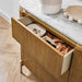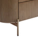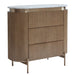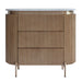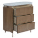 An embodiment of modern craftsmanship, the Demarco chest of drawers in antique gold exudes sophisticated allure. Showcasing a ribbed texture and sleek brass accents, this stunning piece is topped with a gracefully curved white Carrara marble top. Its three spacious drawers offer generous storage, combining functionality with aesthetic elegance. Supported by streamlined brass legs, the Demarco chest of drawers delivers timeless style and effortless glamour to any bedroom or living space.