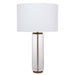 With a body made of a solid clear crystal column , the Forrester Table Lamp draws inspiration from the works of artisan transparent designers. The lamp`s transparency is accented by a brass rod through the crystal and a matching plinth. It is topped with a white linen shade.