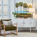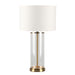 The Left Bank Table lamp is a modern glass table lamp and would be a sleek addition to any space. Features a brass finish metal rod encased in a clear glass cylinder base trimmed with matching brass metal. Topped with a white linen drum shade.