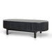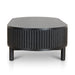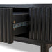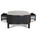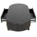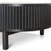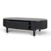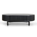 Engineered wood with oak veneer Full black finish with NC coating Vertical wood panel design Oval top shape 1 handleless drawer Push-to-open mechanism Spacious storage compartment Solid oak wood legs Weight Capacity: 50 kg Required two person assembly