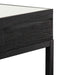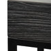 Recycled elm and fir wood construction in an all-black finish Polished glass overlay with pyramid-shaped raised inner panels Linear iron frame and base in powder black Frame seamlessly drops down to form a rectangle-shaped base Exterior crafted with minimal lines and wood grain details Product is fully assembled Note: Each piece will have its own unique imperfections and markings due to the nature of the wood.