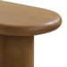 New elm wood top and base with veneer Complete natural finish Visible wood grain patterns Oval-shaped top design Cylindrical legs for support Weight Capacity: 60 kg Minor assembly required