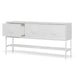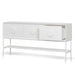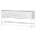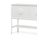 Engineered wood with White oak veneer White metal frame legs with attached bottom shelf 3x drawers with round wooden handle Soft closing rail for drawers 30kg weight limit on top and 5kg for drawer Minor Assembly required to attach legs to the unit