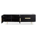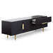 Add a touch of sophistication to your living room with the Matte Black TV Entertainment Unit - Brass Legs and Handle. Featuring luxurious brushed brass accents, vertical wood slat detailing, and rounded edges, this unit brings timeless style and exceptional functionality to your entertainment space. A modern design with ample storage ensures it meets all your media and decor needs.