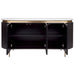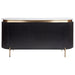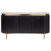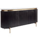 An enduring example of expert craftsmanship, the Demarco buffet boasts contemporary curvature and style with its mid-century modernism profile and detailed ribbed facing finished in a chic black satin. The attention to detail on this sleek and sophisticated piece adds to its confident charisma. Streamlined brass finished iron legs and slender gold plinth support a perfectly curved white Carrara marble top adding striking contrast to this timeless combination. Concealing a fixed shelf and coordinating black finished interior, the Demarco buffet offers ample storage and is a glamourous testament of elevated form and function.