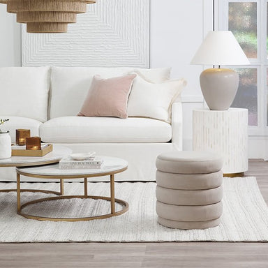 Introduce a touch of elegance to your space with this round velvet fringe ottoman, available in soft pink, ivory, and duck egg blue vel...