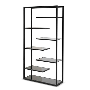 Stable steel frame in a powder black finish Clear tempered glass shelves with a tinted exterior Asymmetrical and alternating shelf design Multiple ...