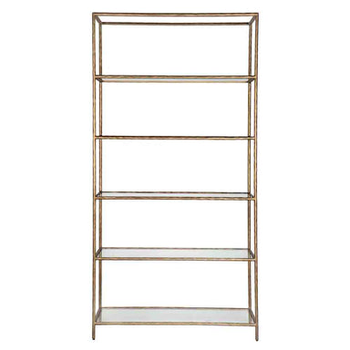 Features multiple shelving for convenient display or storage space Stable metal frame in a brushed gold finish offers sturdy support Clear tempered...