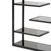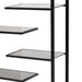Stable steel frame in a powder black finish Clear tempered glass shelves with a tinted exterior Asymmetrical and alternating shelf design Multiple shelving for convenient display or storage space Minimalist designs gives off the appearance of floating shelves Tall, wide, and narrow design to fit any space Minor assembly required