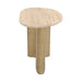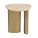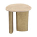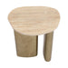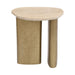 Elevate your interiors with this chic, sculptural side table, available in two complementary sizes that can be paired together or styled individually. Featuring a smooth travertine top and a modern antique brass-finished base, each piece embodies timeless sophistication. Their asymmetrical designs add a contemporary edge, making them perfect accents for any living room, bedroom, or office. Ideal for holding decor or everyday essentials, these versatile tables combine practicality with style, enhancing both modern and classic spaces with their luxurious finish.