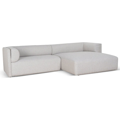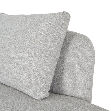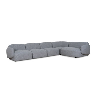 Clay grey polyester upholstery Plywood frame Foam filling Black powder-coated plywood legs Rounded edges and plush design Left-facing chaise Subtly...