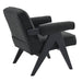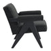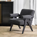 Embrace timeless elegance and sophistication with the Ambrose arm chair. A versatile occasional arm chair that seamlessly fuses contemporary appeal with a Mid Century design. Upholstered seat, arms and back cushions available in high-wearing black boucle add comfort and style to any modern classic interior. Tapered wood veneer legs, hand-painted in a sleek black finish, ground this distinguished design.