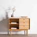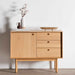 The Narrow Wooden Sideboard and Buffet - Natural is the perfect blend of rustic charm and contemporary design. Constructed from solid American white oak and oak veneer, this sideboard offers ample storage with its three drawers and one cupboard with concealed shelves. The softened edges and rounded legs in an all-natural finish add a touch of elegance, making it a versatile addition to any dining room or living space.